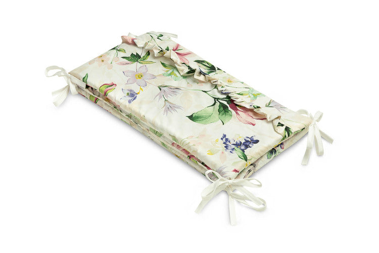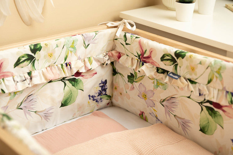 Obroba za otroško posteljico je primerna za vse standardne otroške posteljice in se odlikuje po čudovitih materialih ter elegantnem všitem volančku, ki bo otroško sobico naredil še bolj posebno. Izdelana je iz mehkega bombaža s potiskom, mehko polnilo iz vate pa učinkovito ščiti otroka pred udarci ob letvice posteljice med gibanjem.