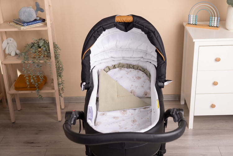 Popoln komplet za voziček, ki daje prednost udobju vašega dojenčka. Popoln komplet za voziček, ki ga sestavljata blazina in odeja, je edinstveno zasnovan za maksimalno udobje vašega dojenčka. Obrnljiva zasnova naredi komplet praktičen in eleganten, njegova vsestranskost pa ga naredi idealno darilo za novorojenčke. Kombinacija bombaža in muslina zagotavlja ne le udobje, temveč tudi vzdržljivost in eleganten videz.