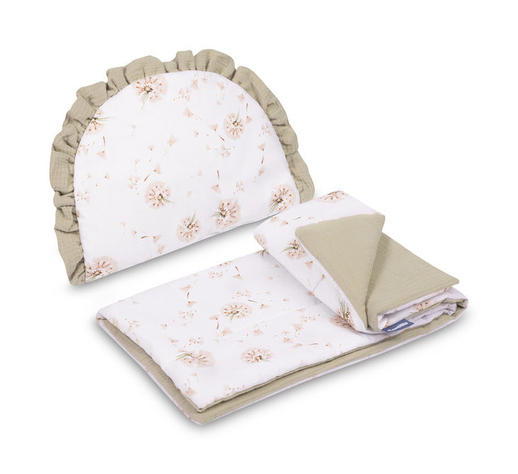 Komplet za voziček je funkcionalen in eleganten ter zagotavlja udobje za vašega otroka v različnih situacijah. Idealen je za uporabo v zibelki ali vozičku, komplet pa se odlično obnese tudi doma – tako v otroški posteljici kot mehka igralna podloga. Blazina, ki služi tudi kot plišasta igrača, ponuja dodatno udobje in občutek varnosti.