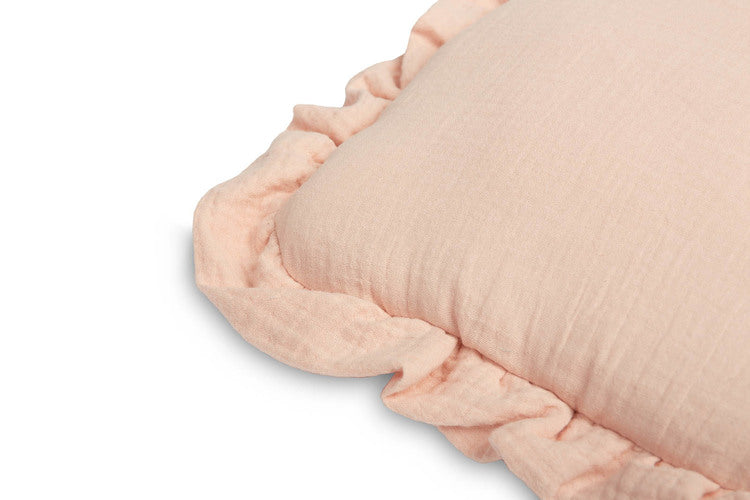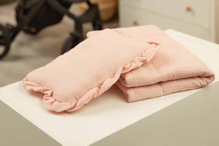 Komplet vključuje vzglavnik in odejo iz prijetnega muslina, primeren za voziček, otroško posteljico ali kot mehka podloga za dojenčka.
