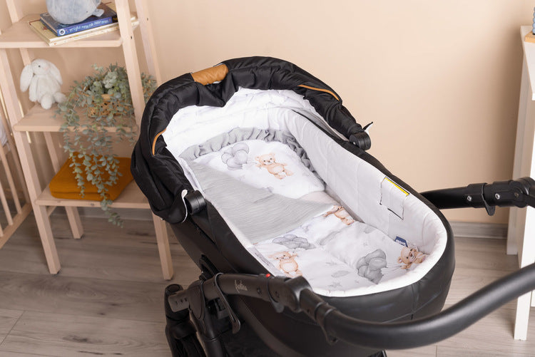Komplet za voziček je funkcionalen in eleganten ter zagotavlja udobje za vašega otroka v različnih situacijah. Idealen je za uporabo v zibelki ali vozičku, komplet pa se odlično obnese tudi doma – tako v otroški posteljici kot mehka igralna podloga. Blazina, ki služi tudi kot plišasta igrača, ponuja dodatno udobje in občutek varnosti.