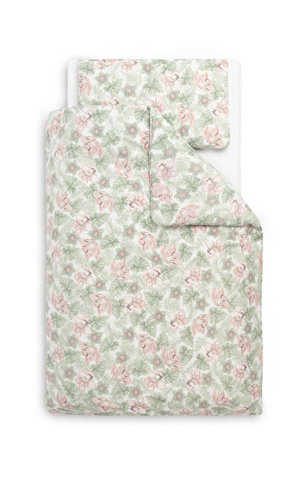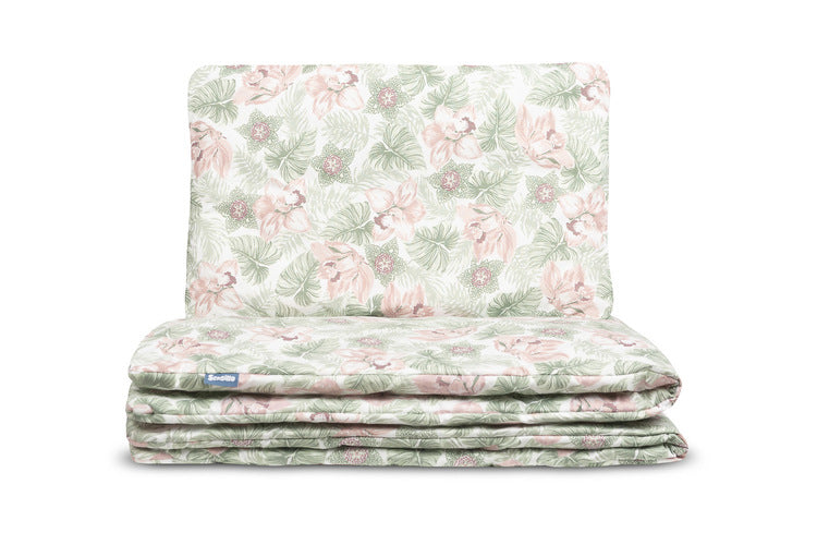Posteljni set vključuje vzglavnik in odejo s 260 g/m² gramaturnim polnilom, ki zagotavlja toplino in pravilno kroženje zraka celo leto. Izdelan je iz visokokakovostnega mehkega 100 % bombaža in anti-alergijskega polnila, ki ne draži občutljive kože dojenčka. Robovi odeje in vzglavnika so zaobljeni, kar zagotavlja dodatno udobje.