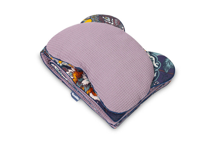 Komplet ima antialergijsko polnilo, ki zagotavlja ustrezno toplotno izolacijo in udobje. Blazina lahko služi tudi kot ljubkovalna igračka. Set je izdelan iz 100 % bombaža – ena stran je okrašena s potiskom, druga pa iz mehke bombažne tkanine z waffle (vafljasto) strukturo, ki daje kompletu poseben in moderen videz.