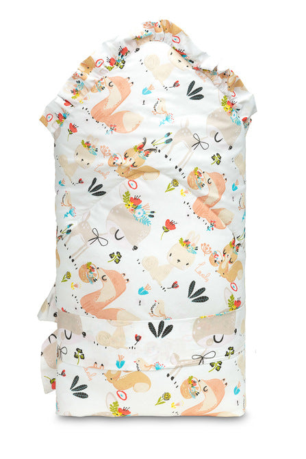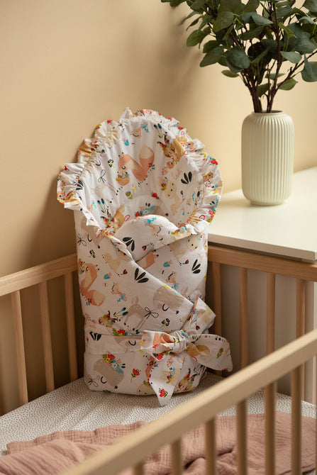Po razgrnitvi jo lahko uporabljate kot odejico za posteljico ali voziček, prav tako pa služi kot mehka podloga za igro. Izdelana je iz 100 % bombaža, polnilo pa predstavlja puhasta antialergijska silikonska netkana vlakna, ki zagotavljajo toplino in udobje. Celoten videz dopolnjuje eleganten in nežen volanček.