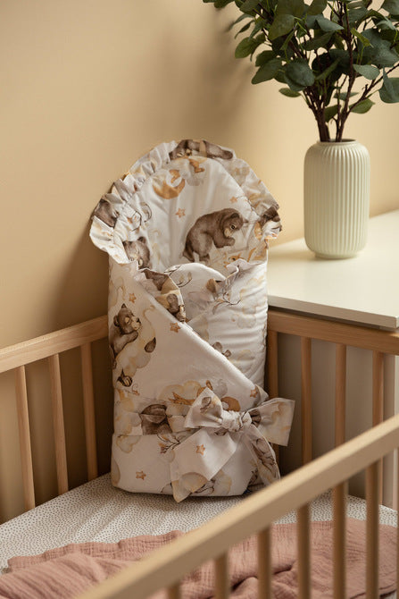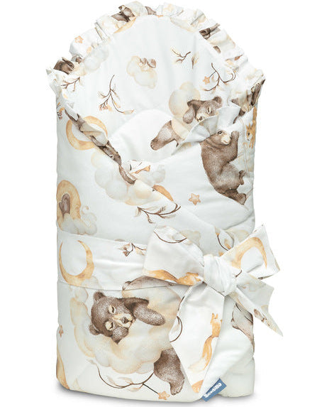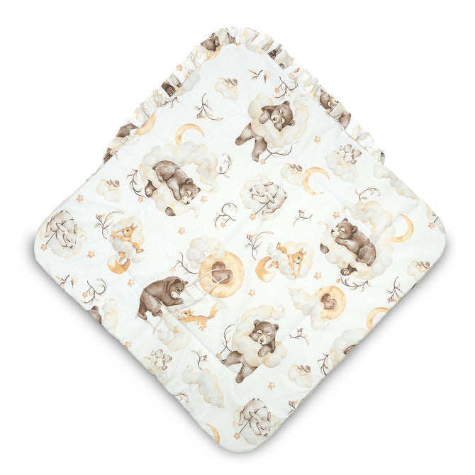 Ausgebreitet dient sie als Decke für Kinderbett oder Kinderwagen und gleichzeitig als weiche Spielmatte. Sie besteht aus 100 % Baumwolle und ist mit flauschigen, antiallergischen Silikon-Vliesfasern gefüllt, die Wärme und Komfort bieten. Eine elegante, zarte Rüsche rundet das Design ab.