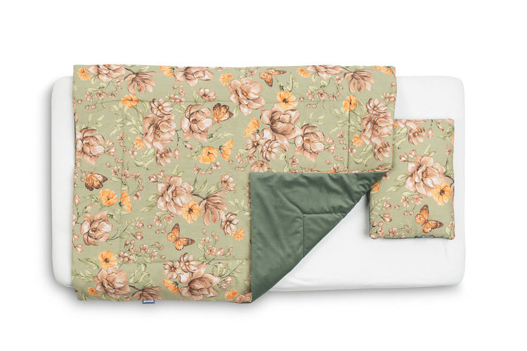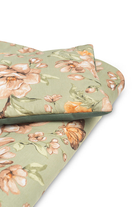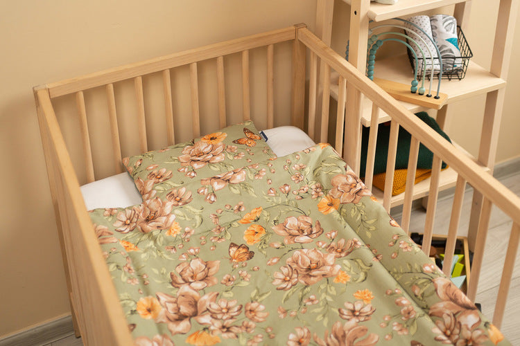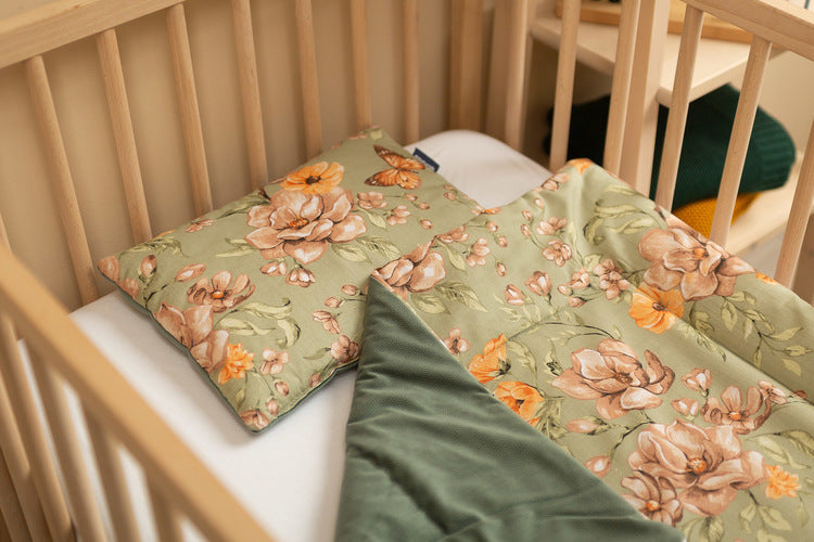 Set za krevetić izrađen je od visokokvalitetnog pamuka u boji s jedne strane i ugodnog, mekog baršuna s druge strane . Uključuje ravni jastuk i dekicu s antialergijskim punjenjem , koji će svaki trenutak sna vaše bebe učiniti još ugodnijim. Mekani i udobni materijal nježno će omotati vašu bebu.