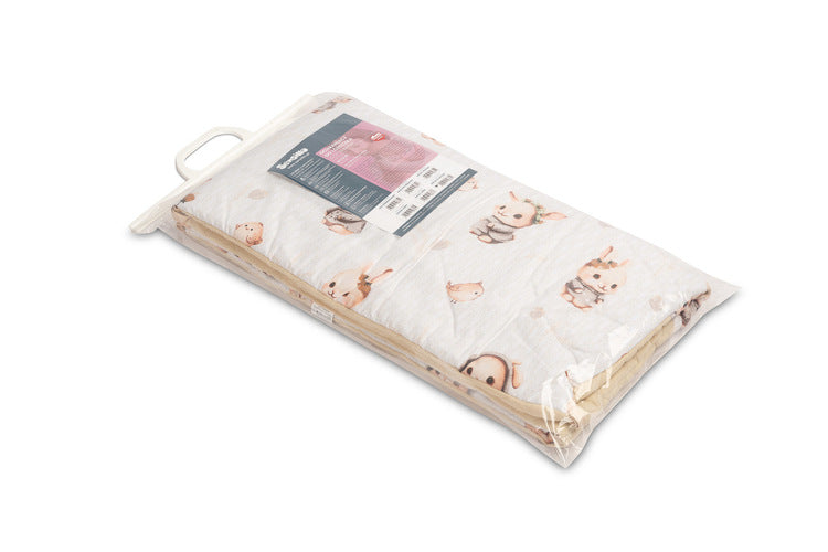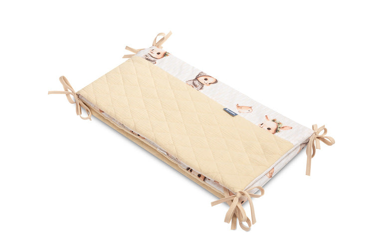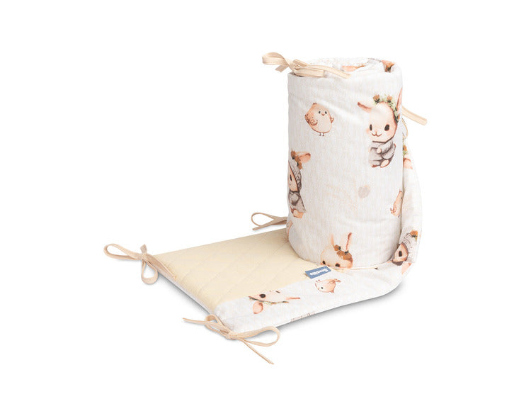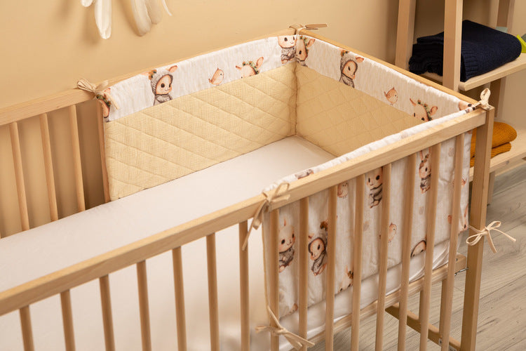 Zaščitite posteljico vašega malčka z mehko in prikupno obrobico Beige Bunny. Izdelana iz 100 % bombaža in prijetnega muslina, obrobica nudi udobje, varnost in estetski pridih v otroški sobici. Polnilo iz poliestra ublaži morebitne udarce ob ograjice, trakovi pa zagotavljajo stabilno pritrditev. Primerna za standardne posteljice dimenzij 120 × 60 cm.