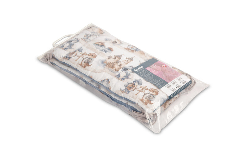 Zaščitite posteljico vašega malčka z mehko in prikupno obrobico Dragons. Izdelana iz 100 % bombaža in prijetnega muslina, obrobica nudi udobje, varnost in estetski pridih v otroški sobici. Polnilo iz poliestra ublaži morebitne udarce ob ograjice, trakovi pa zagotavljajo stabilno pritrditev. Primerna za standardne posteljice dimenzij 120 × 60 cm.