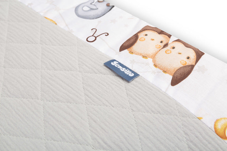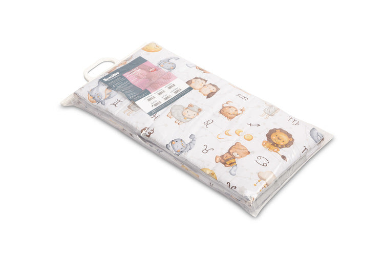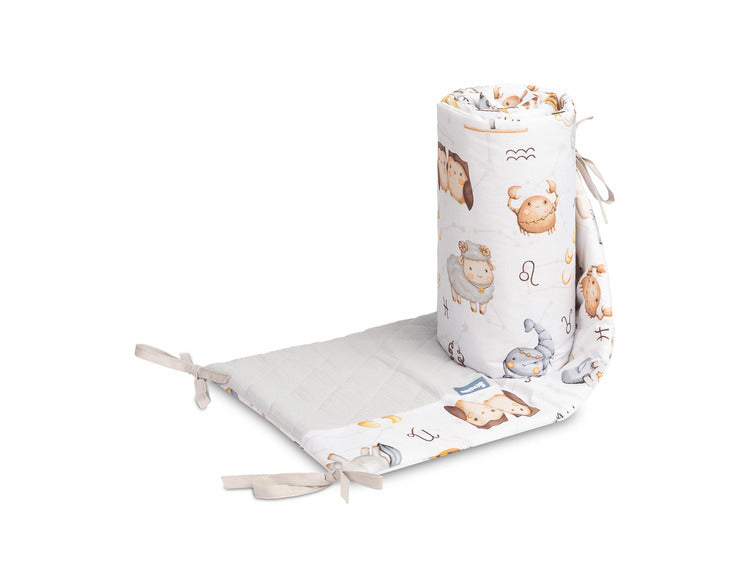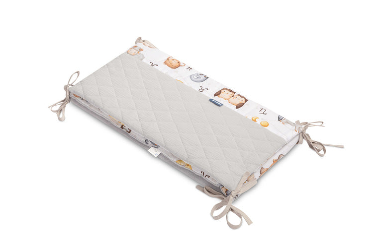 Zaščitite posteljico vašega malčka z mehko in prikupno obrobico Zodiac. Izdelana iz 100 % bombaža in prijetnega muslina, obrobica nudi udobje, varnost in estetski pridih v otroški sobici. Polnilo iz poliestra ublaži morebitne udarce ob ograjice, trakovi pa zagotavljajo stabilno pritrditev. Primerna za standardne posteljice dimenzij 120 × 60 cm.