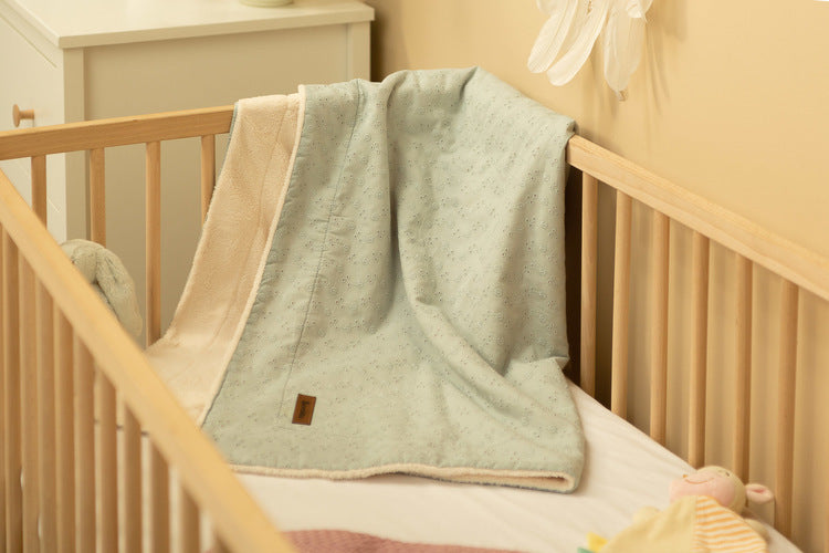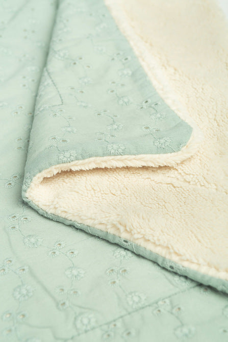 Zaradi dvostranske uporabe jo lahko prilagodite svojim potrebam – ena stran je iz nežnega bombaža, druga iz toplega pliša. Odeja je lahka in praktična, zato v vozičku zavzame zelo malo prostora. Okrašena je z elegantno cvetlično vezenino, ki ji daje poseben in prefinjen videz.