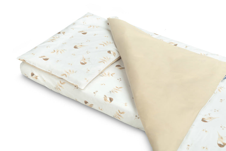Prevleke za odejo in vzglavnik so z zadrgo, rjuha pa ima všito elastiko za boljše prileganje. Kombinacija vzorčastega bombaža in enobarvnega dela odeje bo popolnoma dopolnila vsak otroški prostor.